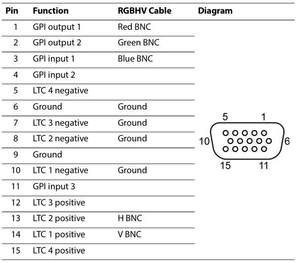 The LTC/GPI connector is a 15-pin, D-sub connector (DE-15 socket) that includes both Linear Time Code (LTC) input and outputs, and a subset (3 inputs and 2 outputs) of the General Purpose Interface. |