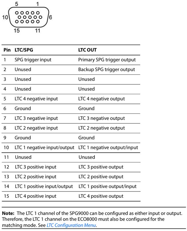 The ECO8000 has 4 channels for Linear Time Code (LTC) signals. These four channels share common 15-pin, D-sub connectors (DE-15 socket, also known as HD-15) along with a general-purpose trigger signal from the SPG9000. Standard VGA cables with DE-15 pin connectors can be used to connect each SPG9000 output to the ECO8000 inputs. |
